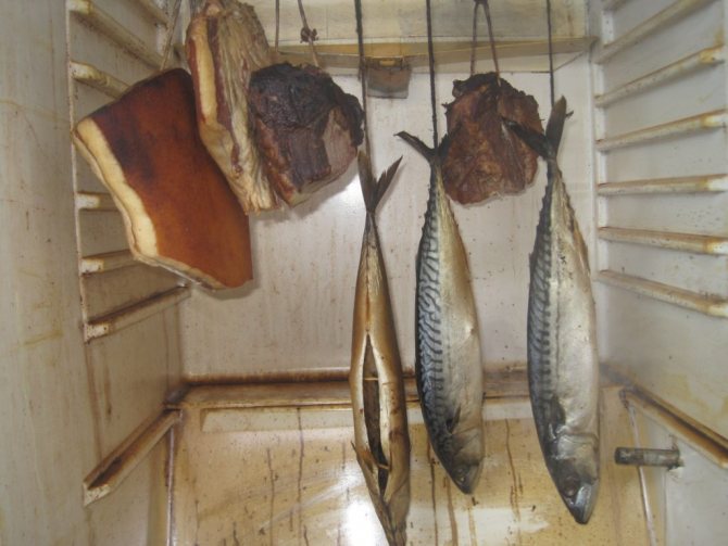 Avant le processus de fumage, les aliments sont suspendus et disposés dans le réfrigérateur, après quoi la porte est bien fermée.