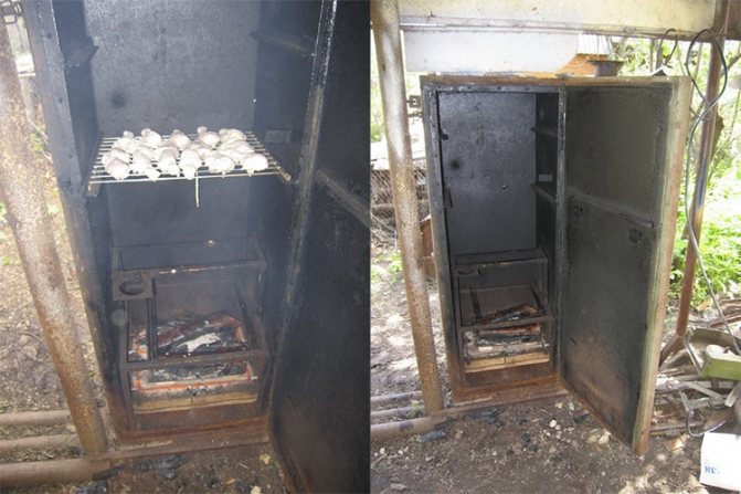Pour la formation de fumée persistante, la fosse doit être recouverte d'une feuille de métal ou de quelque chose d'autre qui s'adapte parfaitement à la surface. Le réfrigérateur avec des aliments déjà préparés est bien fermé. Après cela, le processus de fumage a lieu;