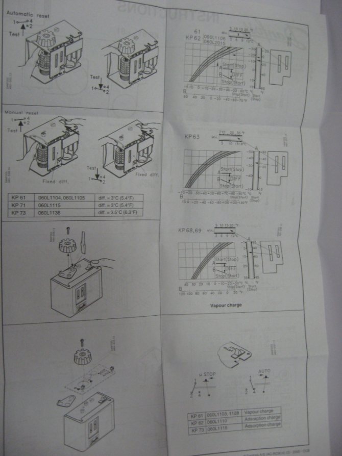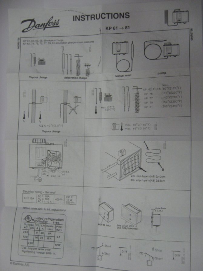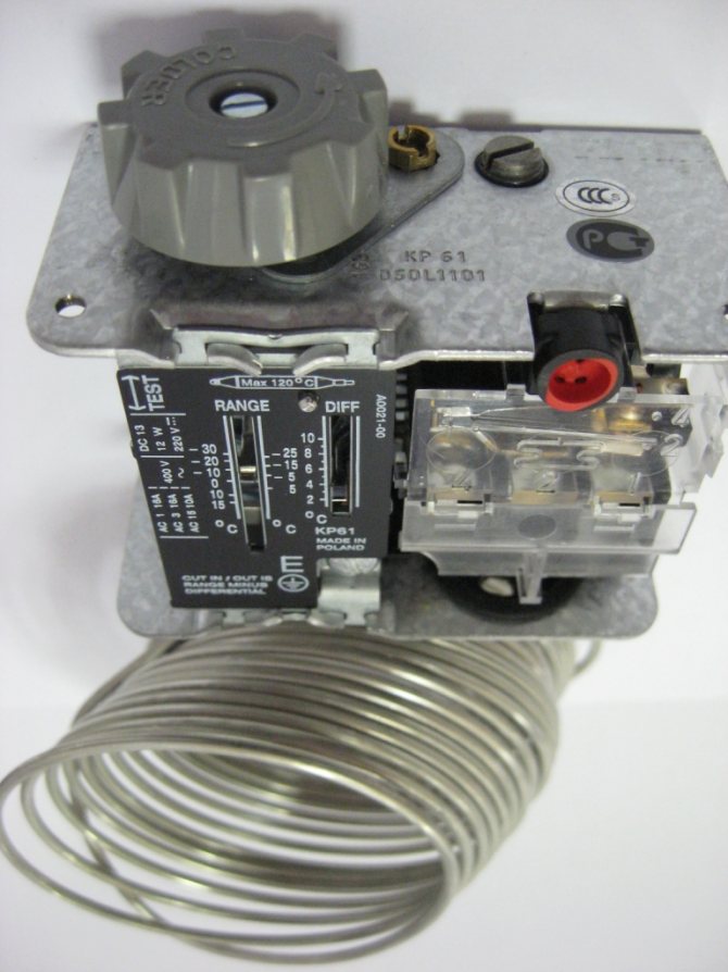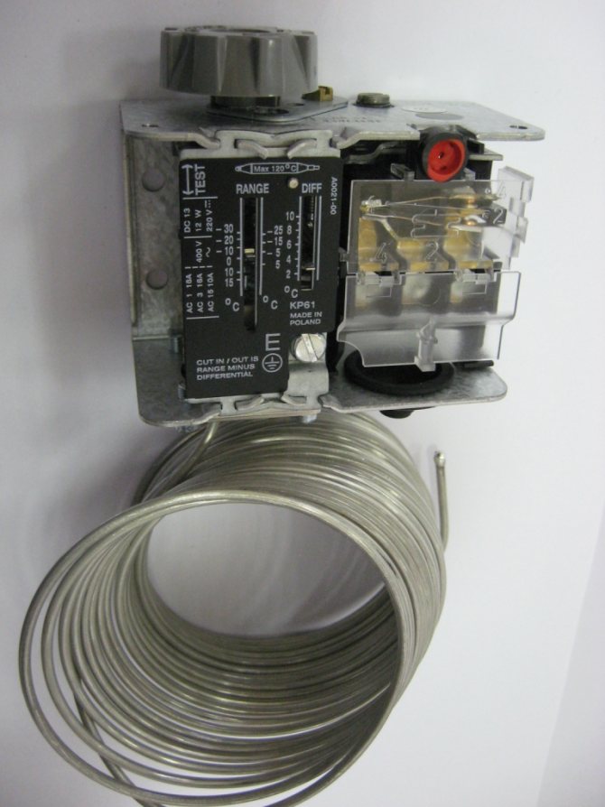Le nombre de contacts peut varier de 2 à 6, et la longueur du tube rempli de fréon peut être de 0,8 à 2,5 mètres. Cela dépend des fonctions supplémentaires du thermostat, du régime de température et du nombre de modules frigorifiques enfichables (éclairage, dégivrage, indication). Il n'est pas recommandé de démonter le thermostat de travail pour étudier la structure interne.