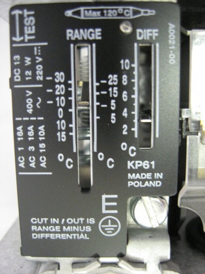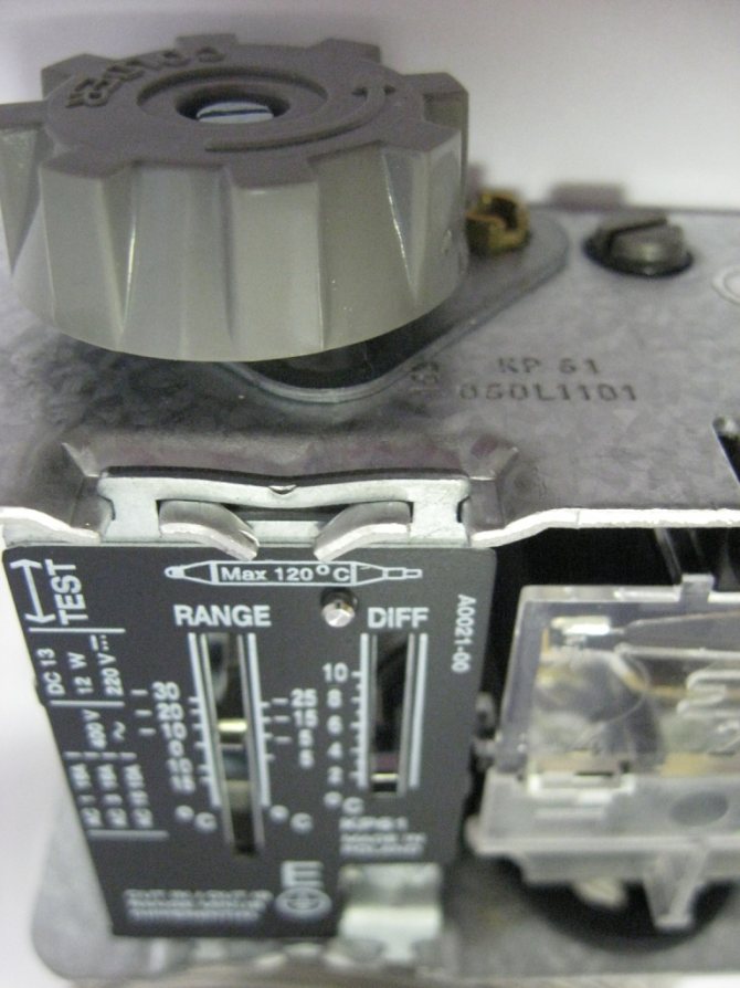 Figure 9.7 - Danfoss KP61, échelle de réglage de la température et de l'hystérésis.