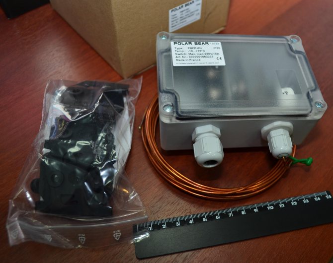 Découvrez un autre thermostat capillaire de Polar Bear. Appelé PBFP 6N. Le chiffre 6 dans le nom du thermostat caractérise la longueur du tube capillaire. Ici, il fait 6 mètres. Ce thermostat est également intéressant en ce qu'il est livré immédiatement complet avec des supports pour le montage du tube capillaire, qui sont représentés en position 2 de la figure 9.13. Sur la figure 9.14, ces agrafes sont visibles sur le côté gauche de la photo, elles sont noires et emballées dans un sac en plastique. Lorsque vous travaillez avec d'autres thermostats, veuillez noter que les supports peuvent être vendus séparément. Précisez lors de l'achat - s'ils sont inclus ou s'ils doivent être commandés séparément.