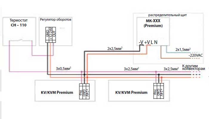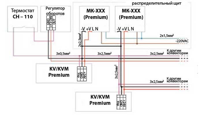 Les convecteurs au sol pour le chauffage de l'eau à convection forcée doivent être connectés à un système 220V.En règle générale, 220V est fourni au transformateur (module, convertisseur), du transformateur 12V, 24V (selon le fabricant et les modèles) sont transmis au ventilateurs situés dans le convecteur. Il est également transmis du transformateur au thermostat d'ambiance. Du thermostat au convecteur. C'est ainsi que les convecteurs de sol avec ventilateurs sont régulés et contrôlés.