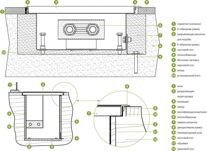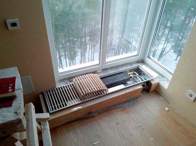 Avec un rapport suffisamment faible entre la surface des fenêtres et la surface du sol, des pertes de chaleur importantes se produisent. De plus, un froid désagréable souffle du vitrage géant. Le problème est partiellement résolu par l'installation de vitrages triples, mais ils se distinguent par leur coût élevé. Par conséquent, nous pouvons acheter en toute sécurité des convecteurs de sol et procéder à leur installation de nos propres mains.
