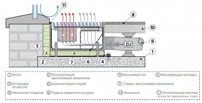 - Le schéma d'installation du convecteur montre qu'à la fin de tous les travaux il est impératif d'installer une grille décorative.