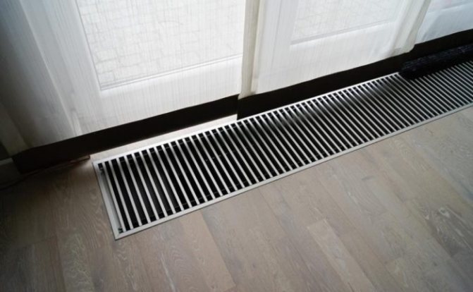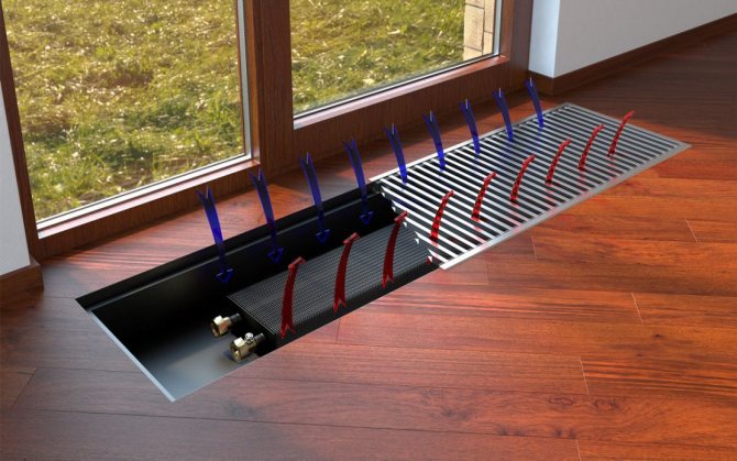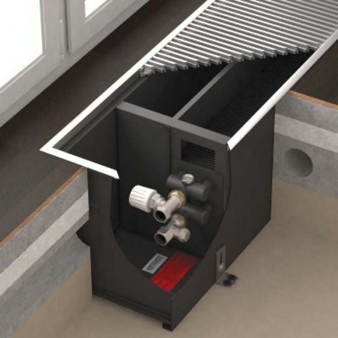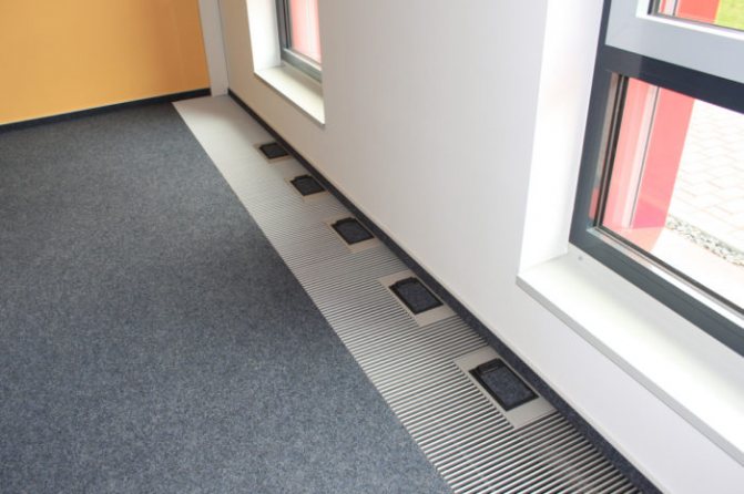 Important! L'efficacité des radiateurs au sol avec ventilateur est augmentée jusqu'à 90%. Ceci est réalisé grâce à une meilleure circulation de l'air. Le ventilateur peut être désactivé si nécessaire.