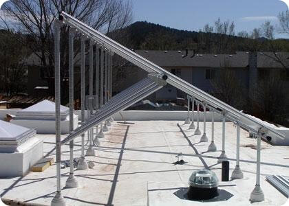 - Sur un toit plat d'un immeuble. Dans de telles conditions, il est nécessaire de fabriquer un cadre métallique spécial avec un plan incliné pour la fixation de panneaux solaires à un angle par rapport au toit.
