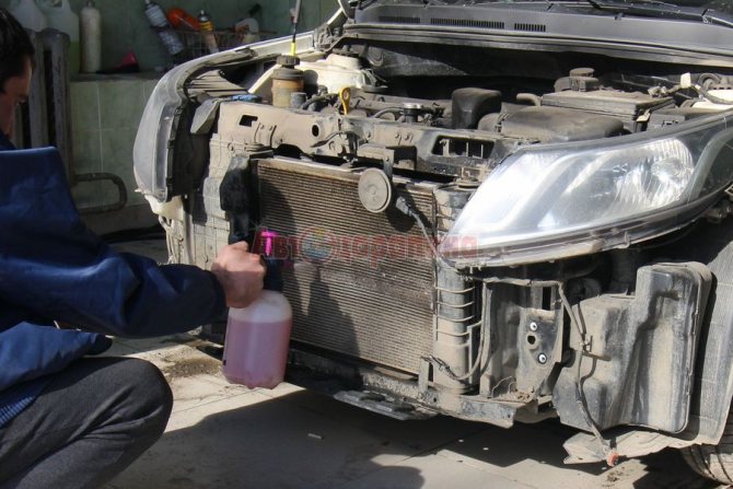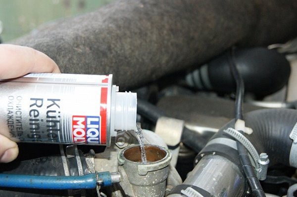 Il est impératif d'ajouter un nettoyant pour radiateur au liquide distillé versé dans le système de refroidissement. L'efficacité du lavage augmente plusieurs fois. Le dosage du produit chimique sera indiqué sur les instructions. Il doit être observé pour éviter d'endommager le système de refroidissement.