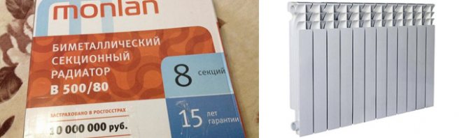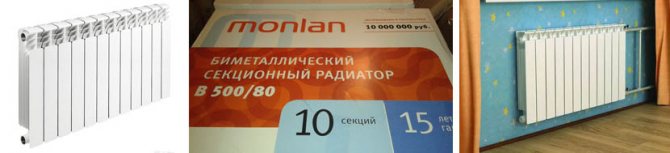 Les radiateurs bimétalliques Monlan sont fabriqués à partir de deux métaux différents. Le corps est en alliage d'aluminium et les tuyaux qui forment le noyau à l'intérieur sont en acier. Cette dernière circonstance a un effet néfaste sur le transfert de chaleur, le réduisant de plusieurs fois (par rapport aux analogues en aluminium de Monlan), cependant, l'acier gagne en résistance à la faible qualité de l'eau et à une augmentation de sa température (résiste jusqu'à 130 ° C ). De plus, les radiateurs bimétalliques ne sont pas aussi sensibles aux coups de bélier et sont faciles à installer. Un inconvénient majeur est le prix, qui est 1,5 fois plus élevé que celui de l'aluminium.