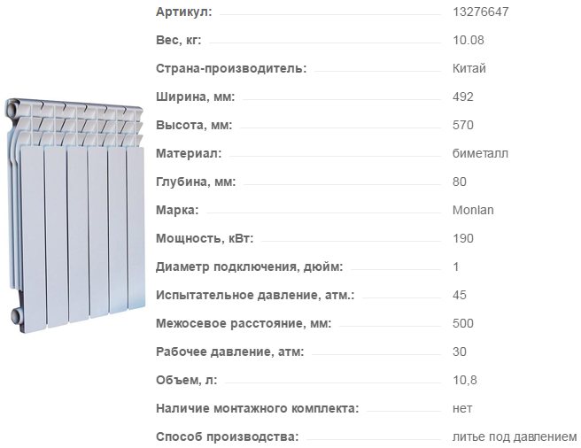 - Le radiateur bimétallique Monlan 500/80 est protégé de manière fiable contre les chocs hydrauliques, grâce à ses caractéristiques de conception. Selon les avis des clients, l'équipement offre les meilleures performances et un prix abordable. Une bonne convection, la sécurité d'utilisation, le facteur de sécurité, la conception originale plaident également en faveur de tels appareils.