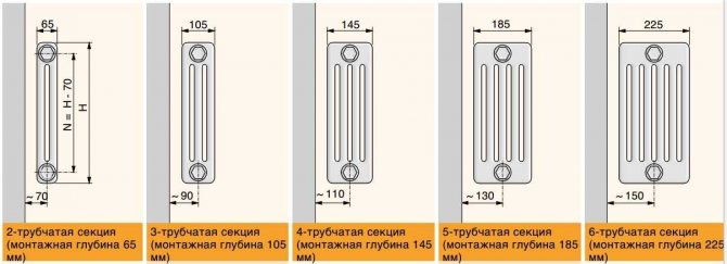 Une petite profondeur se produit dans les radiateurs tubulaires en acier: les radiateurs à deux tubes sont fabriqués avec une épaisseur de 50 mm, les radiateurs à trois tubes de 100 mm à 110 mm, tous les autres sont déjà plus solides - à partir de 135 mm et plus.