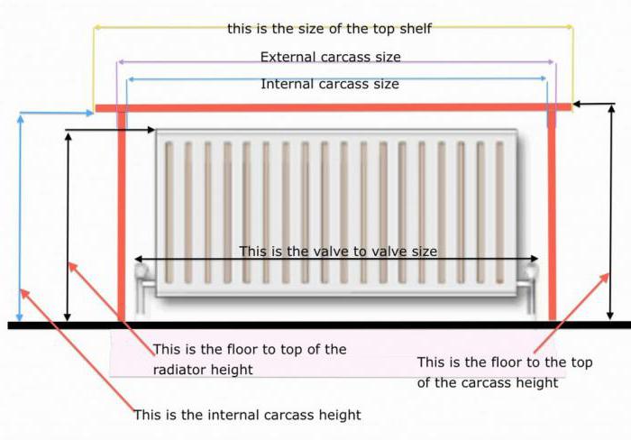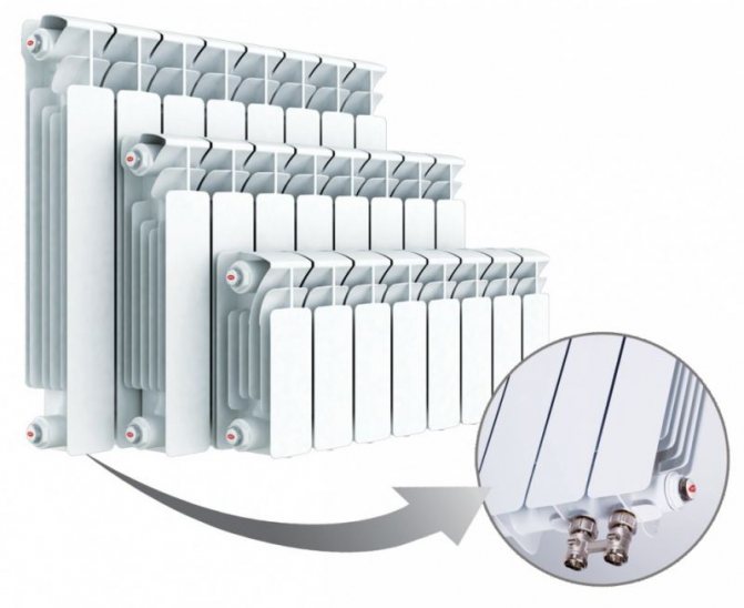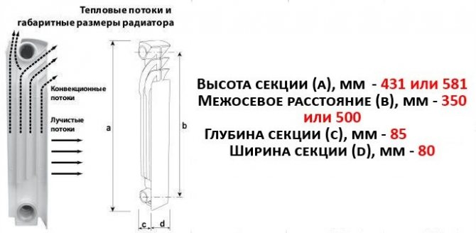 Si le radiateur a une structure en coupe, la profondeur et la largeur se réfèrent aux dimensions de la section. De plus, la profondeur du radiateur sera la même et la largeur de la batterie dépend du nombre de sections requis (vous devez ajouter environ 1 cm de plus aux joints qui conviennent à l'étanchéité des joints).