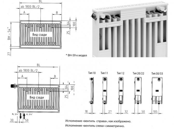 Les radiateurs à panneaux en acier sont rarement produits avec un entraxe de 500 mm. Mais encore, il y en a. Par exemple, la campagne Kermi a fait les dimensions de raccordement suivantes spécialement pour le remplacement: elles sont dans la ligne Plan-K et Profil-K. Il existe également des radiateurs de taille standard dans le modèle russe: le modèle RSV-1.