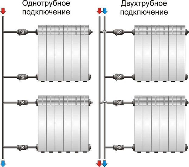 Un tel système résout les problèmes liés à la régulation du transfert de chaleur pour chaque appareil de chauffage dans un système à un seul tuyau. Chaque batterie a des vannes d'arrêt et avec son aide le débit du liquide de refroidissement à travers elle est régulé.