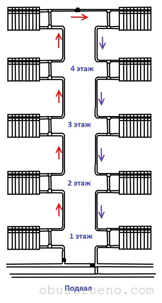 En règle générale, dans les bâtiments à plusieurs étages, un schéma de câblage à un tuyau avec un remplissage supérieur ou inférieur est utilisé. L'emplacement du tuyau droit et du tuyau de retour peut varier en fonction de nombreux facteurs, y compris même de la région où se trouve le bâtiment. Par exemple, un système de chauffage dans un bâtiment de cinq étages sera structurellement différent du chauffage dans un bâtiment de trois étages.