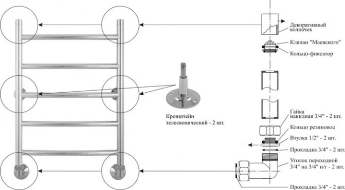 Lorsque les prises d'eau sont situées dans le mur, à proximité immédiate de l'endroit où le sèche-serviettes est installé, par exemple une «échelle» avec une connexion inférieure, il est pratique d'utiliser un assemblage de raccords filetés métalliques, en laiton ou en acier inoxydable pour la connexion. Un "mamelon" est connecté à la sortie d'eau, après quoi, si nécessaire, une rallonge, un angle avec un filetage interne ou externe, puis un manchon américain et un manchon de transition peuvent être installés.