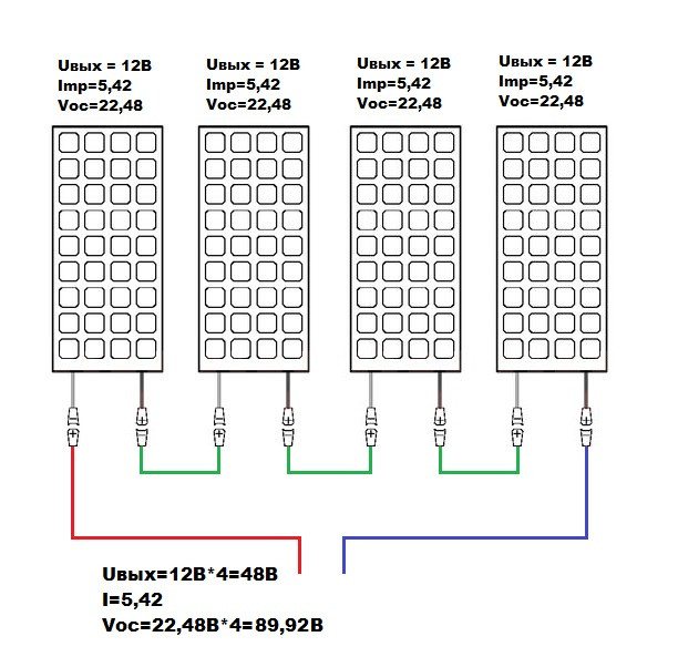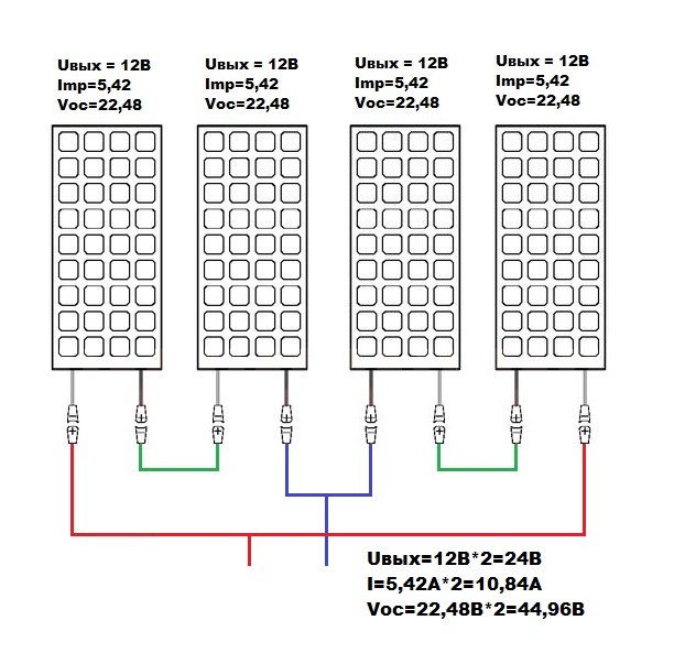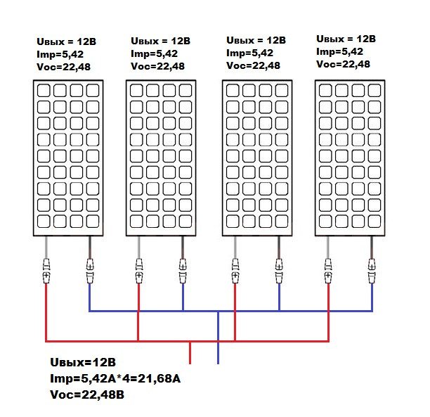 En connectant 4 de ces panneaux en parallèle, nous obtenons la tension de sortie nominale égale à 12V, la tension en circuit ouvert restera de 22,48V, mais le courant sera de 5,42A * 4 = 21,68A.