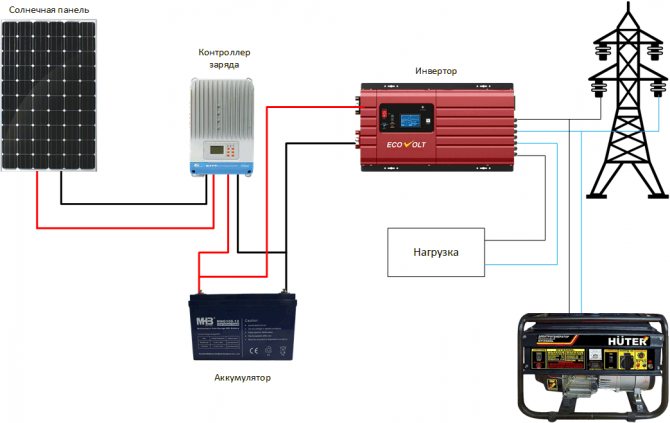 De telles centrales électriques à l'aide de batteries rechargeables accumulent la charge du soleil pour la maison et la stockent, la réservant dans des banques de batteries. En Amérique, au Japon, dans les pays européens, l'alimentation hybride est souvent utilisée.