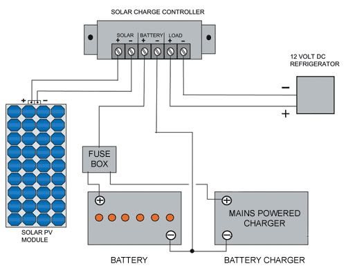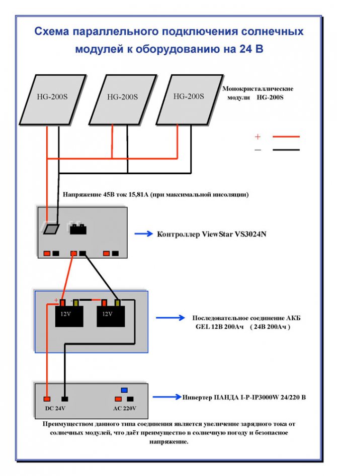 Parfois, un schéma simplifié de connexion de modules sans contrôleur est utilisé. Cette option est utilisée dans des conditions où le courant des panneaux ne pourra certainement pas créer une surcharge des batteries. Habituellement, cette méthode est utilisée :