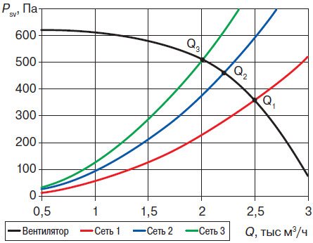 Les concepteurs fournissent des paramètres avec peu ou pas de colmatage à l'esprit: l'image montre l'écart de pression statique du même ventilateur dans différents réseaux de ventilation