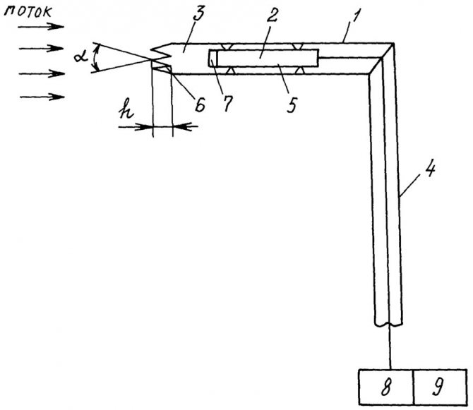 Schéma du récepteur de pression totale: 1 - tube récepteur, 2 - transducteur de pression, 3 - chambre de freinage, 4 - support, 5 - canal annulaire, 6 - bord d'attaque, 7 - grille d'entrée, 8 - normalisateur, 9 - enregistreur de signal de sortie , α - angle aux sommets, h - profondeur des vallées
