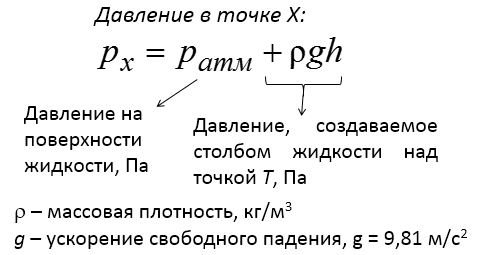 A la surface de l'eau dans le baril, la pression atmosphérique est établie (notée par une petite lettre p avec l'indice "atm"). Respectivement, excès la pression de surface est de 0 Pa. Considérons maintenant la pression au point X... Ce point est approfondi par rapport à la surface de l'eau à distance h, et en raison de la colonne de liquide au-dessus de ce point, la pression y sera supérieure à celle de la surface.