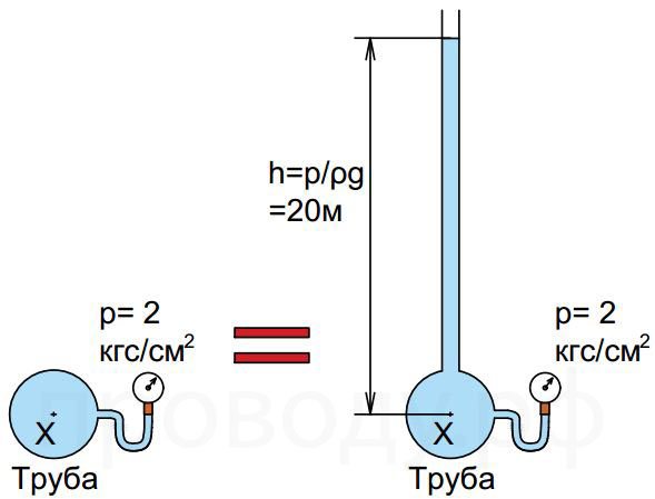 Voyons maintenant la pression dans les pipelines. Que signifie physiquement la pression mesurée par le capitaine à un certain point (X) de la canalisation? Le manomètre dans ce cas indique 2 kgf / cm² (2 atm). C'est la surpression dans la canalisation, elle équivaut à 20 mètres de colonne d'eau. En d'autres termes, si un tuyau vertical est connecté au tuyau, l'eau qu'il contient augmentera de la quantité de surpression au point X, c'est-à-dire. à une hauteur de 20 m. Un tuyau vertical en communication avec l'atmosphère (c.-à-d.open) sont appelés piézomètre.
