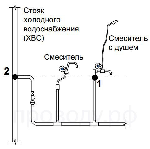 Le point de prise peut être compris comme le point de connexion du mélangeur (point 1)... Ce point est situé à environ 1 m du sol, au même endroit que la connexion à la contremarche de l'appartement lui-même (point 2) ... Autrement dit, la pression à ces points est approximativement la même avec les robinets fermés (l'eau ne bouge pas!). La pression est régulée précisément à ces points et, comme indiqué ci-dessus, doit être au moins 3 à 6 m de colonne d'eau