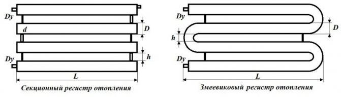 Les registres de chauffage sont des dispositifs tubulaires. Un liquide de refroidissement chaud circule à l'intérieur d'un tuyau à parois lisses, grâce auquel toute la structure et les locaux sont chauffés. En fonction de l'emplacement des contours, les registres sont verticaux et horizontaux, ils se composent d'un nombre quelconque de tuyaux.