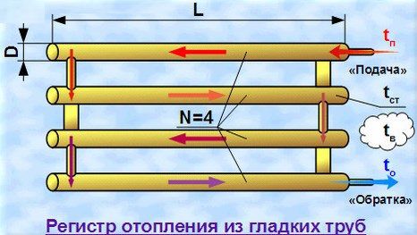 Connaissant ces paramètres, vous pouvez calculer indépendamment la puissance du registre de chauffage. Supposons que la longueur d'une section est de 2 m et le diamètre du tuyau est de 76 mm. Δt est de 60 ° C (80-20). Dans ce cas, la puissance d'une section du registre de chauffage d'un tuyau en acier lisse sera égale à:
