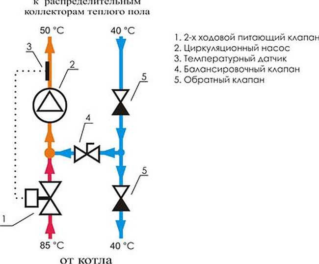 Le "plancher chaud" est monté sous la chape, en outre, différents matériaux de revêtement de sol sont utilisés. Pour cela, le liquide de refroidissement est chauffé à +50 degrés Celsius. Lorsque le chauffage par le sol est directement connecté à une chaudière ou à un système de chauffage centralisé, la température qui en résulte est trop élevée. Pour l'abaisser à l'entrée du circuit, une vanne mélangeuse pour plancher chaud est montée, avec une vanne à deux ou trois voies déjà fournie. Comme son nom l'indique, le but de ces raccords est de mélanger l'eau chaude et froide circulant le long du circuit. Autrement dit, le processus de passage du fluide change - pour le radiateur, l'eau reste chaude et le déjà mélangé, ayant une température plus basse, pénètre dans le sol chaud.