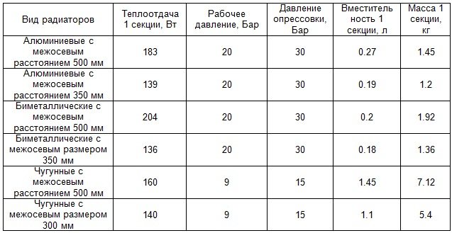 La puissance approximative d'une section d'un radiateur en fonte est de 160 watts, tandis que les appareils en aluminium et bimétalliques ont un paramètre similaire à moins de 200 watts. Par conséquent, dans des conditions de fonctionnement égales, une batterie en fonte doit avoir un grand nombre de sections.