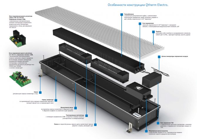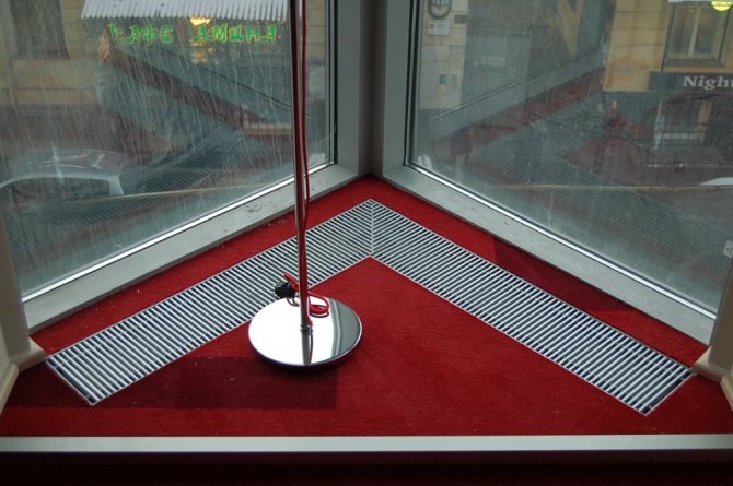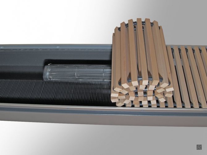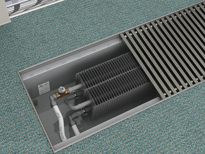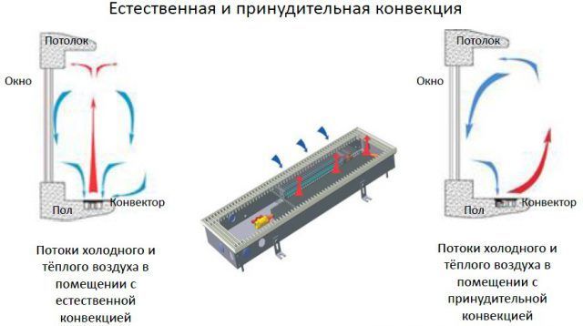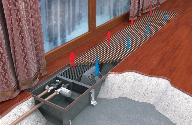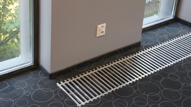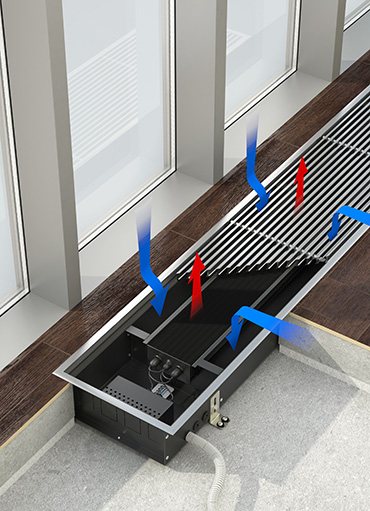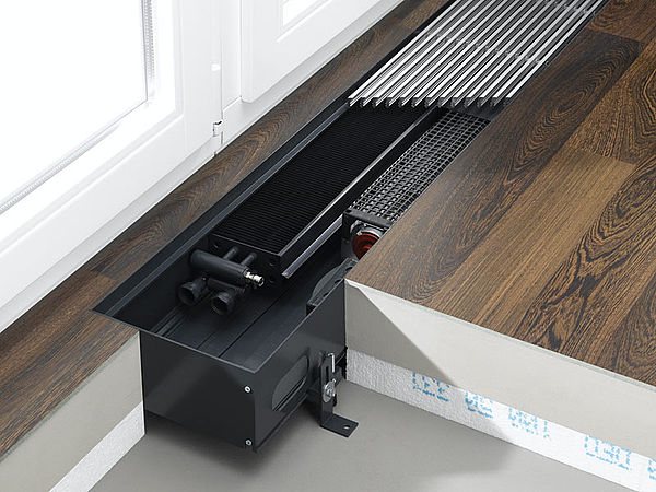 De par leur conception, les batteries de chauffage, qui sont intégrées au sol des locaux, sont des convecteurs - elles utilisent le principe du chauffage à air par convection, qui permet non seulement de maintenir la température optimale, mais également d'économiser considérablement sur le chauffage. Dans le même temps, l'air chauffé au contact du radiateur chauffant circule plus efficacement que dans le cas des radiateurs muraux traditionnels.