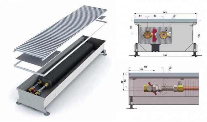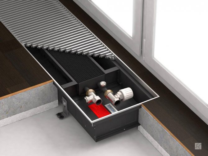 - Conception... En règle générale, les radiateurs de chauffage intégrés peuvent être réalisés avec ou sans boîtier. Dans le premier cas, l'installation de l'équipement est assez simple - la boîte (corps assemblé, 900-3000 mm de long) est installée dans une gouttière de plancher pré-préparée ou un plancher surélevé. Dans le même temps, si nous parlons de ces batteries qui n'ont pas de boîtier, alors avant l'installation, vous devez absolument envisager les options pour leur fixation. De plus, vous devrez prendre soin d'une isolation thermique de haute qualité de la cavité du radiateur, car sinon une partie de la chaleur traversera le sol;