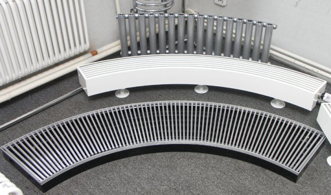 Pour les pièces non standard avec une courbure existante du sol, vous pouvez commander des radiateurs d'angle ou avec le rayon de courbure requis. Il existe des échangeurs de chaleur sur des tuyaux flexibles qui vous permettent d'amener l'appareil au sol et de le remettre en place.