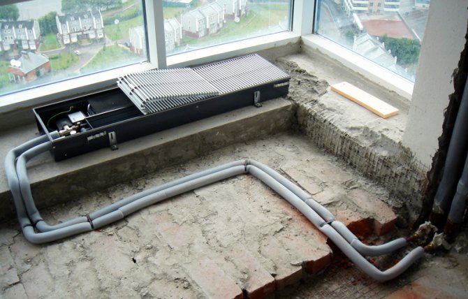 Lors de la coulée de la chape, des tuyaux sont posés pour alimenter le liquide de refroidissement. Et dans la pièce finie, des rainures sont faites, dans lesquelles les tuyaux seront placés. Ensuite, une niche pour l'affaire est en cours de préparation. Dans le même temps, il doit être plus grand que le boîtier du radiateur de 5 mm de largeur et de longueur avec raccordement d'extrémité et de 10 mm avec raccordement latéral. Après cela, le radiateur de chauffage est installé. À ce stade, l'essentiel est de positionner la structure de manière à ce qu'elle ne dépasse pas de la surface du revêtement de sol. Les tuyaux de dérivation sont reliés aux tuyaux d'alimentation en liquide de refroidissement. Les points de connexion doivent être solidement fixés. Pour la vérification, un essai de fonctionnement du système de chauffage est généralement effectué.