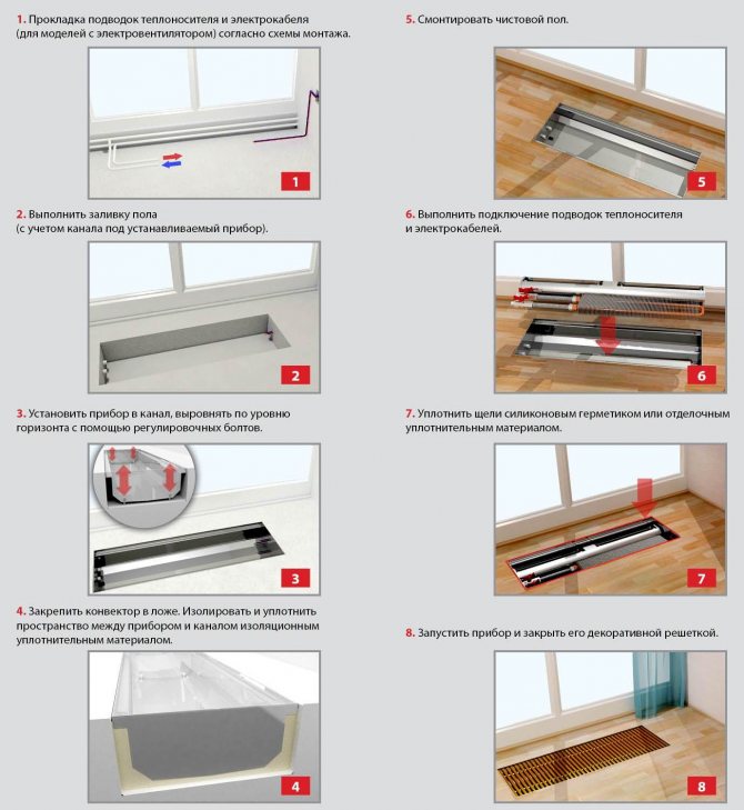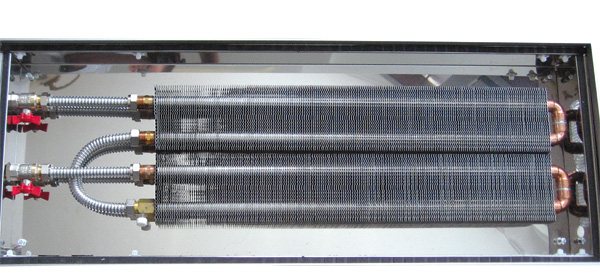 - Les appareils de chauffage par le sol sont disponibles avec ou sans boîtiers. Les premiers sont plus faciles à installer. Tout d'abord, une gouttière est préparée sur la longueur du radiateur, l'appareil y est placé et connecté aux communications. Les tailles des boîtes peuvent aller de 90 cm à 3 m et vous permettent de choisir la bonne option pour n'importe quelle pièce.