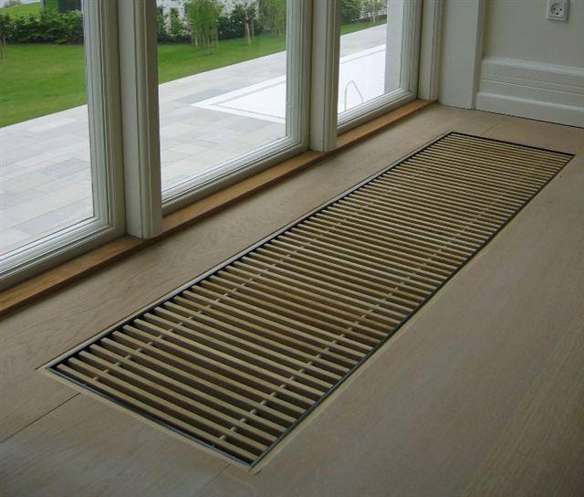 Les radiateurs de chauffage par le sol sont plus souvent utilisés pour les conceptions non standard. Dans les pièces dotées de fenêtres panoramiques, ces batteries remplissent leurs fonctions sans obstruer l'espace ouvert. Ils chauffent non seulement la pièce, mais créent également un rideau thermique, empêchant le flux d'air froid des fenêtres. Ces appareils sont installés dans des maisons privées, des vérandas, des gymnases, des bureaux et d'autres locaux sociaux.