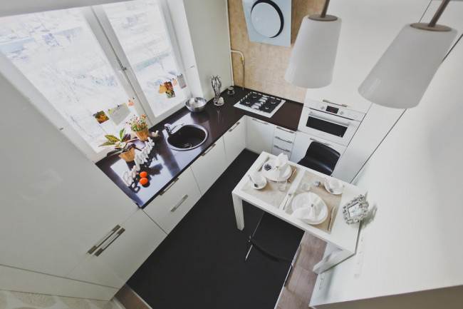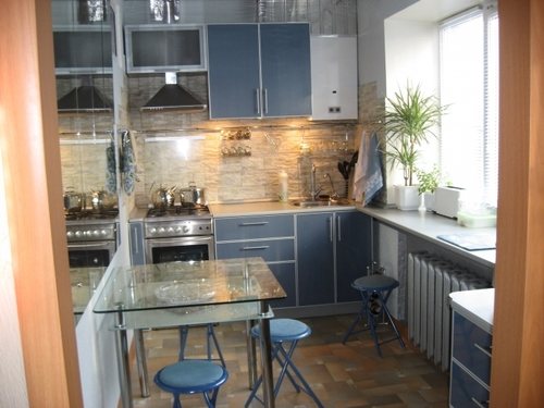 Cette option est particulièrement pertinente s'il n'y a pas de loggia où vous pourriez passer du temps, vous détendre et manger. Si nécessaire, dans une telle cuisine, vous pouvez même installer une table en fabriquant une mini-armoire.