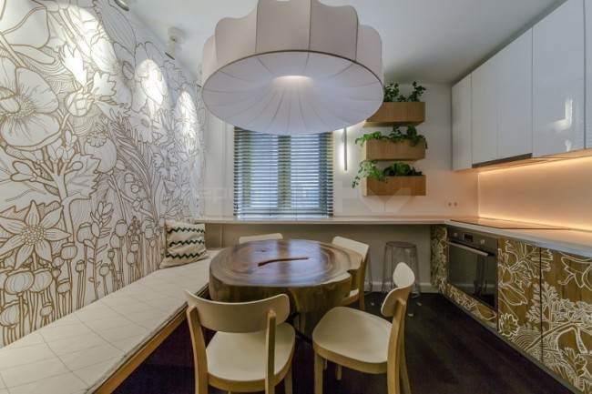 Placer une table à manger ou un petit canapé près de la fenêtre est une excellente option pour une cuisine de taille moyenne de 9 à 15 mètres carrés. m. Si la zone ne permet pas de combiner la cuisine avec le salon, vous pouvez créer une salle à manger dans la cuisine. En règle générale, il est préférable de placer une table avec des chaises près de la fenêtre. En outre, ce projet de conception convient à une petite cuisine avec deux fenêtres. Donc, d'une part, il y a une zone de travail, et d'autre part, une salle à manger.