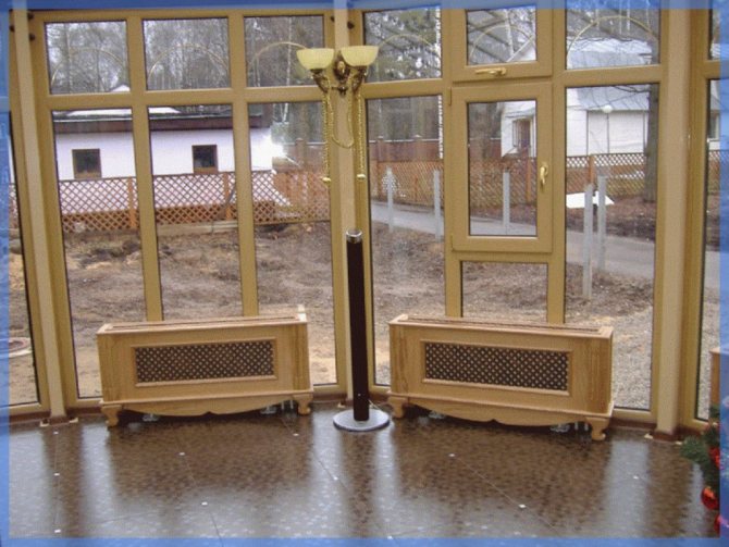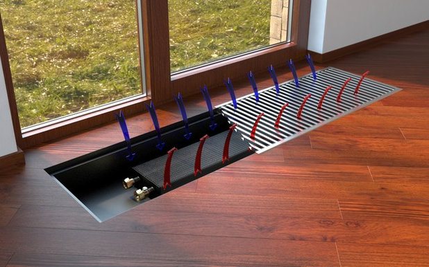 Le convecteur de sol (photo ci-dessus) est installé directement sous la fenêtre et fonctionne comme une batterie ordinaire (uniquement invisible). Un tel convecteur peut être utilisé comme système de chauffage principal même dans une pièce avec des portes-fenêtres, mais vous devez choisir un modèle à convection forcée - un ventilateur.