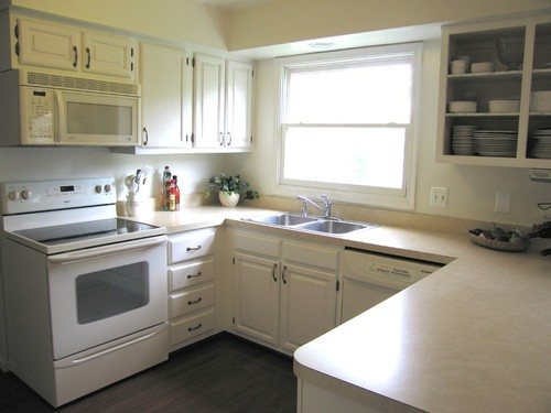 Cuisine blanche en forme de U avec un évier près de la fenêtre