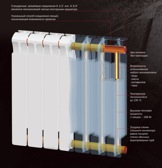 Chaque section du radiateur bimétallique se compose d'une partie intérieure en acier sous la forme de tubes disposés verticalement, et des plaques d'aluminium sont fixées sur le dessus, ce qui donne une apparence attrayante et sert de source de transfert de chaleur. La section est monolithique, la connexion des segments individuels est réalisée par la méthode de soudage sans soudure utilisant des matériaux d'étanchéité. La partie intérieure du noyau en acier est recouverte d'une fine couche d'argent, ce qui augmente la résistance du produit à la corrosion et prolonge sa durée de vie. Le boîtier en aluminium est positionné de manière à maximiser le transfert de chaleur vers l'environnement extérieur, tandis que le design est ergonomique et attrayant, de sorte que les radiateurs ont fière allure dans n'importe quel intérieur.