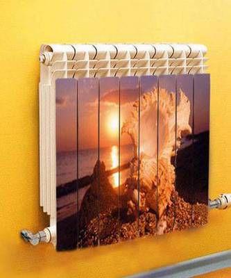 Une autre décoration non seulement de la batterie, mais de l'ensemble du design de la pièce, peut être une photo avec une mer ou un autre paysage de votre choix.L'essentiel dans ce cas est de maintenir la bonne combinaison de l'ombre du mur et des objets entourant le radiateur.