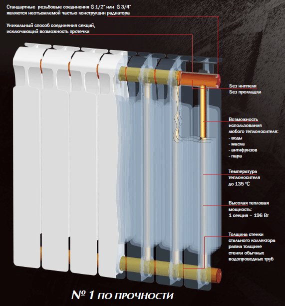 - Je dois juste dire à propos de la ligne Rifar Monolit. Il a un noyau en acier monolithique qui peut résister à des pressions de fonctionnement allant jusqu'à 100 atm.