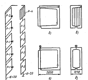 Figure. 3. Panneaux chauffants en béton de séparation: a - schéma de colonne montante d'un système de chauffage à panneau monotube, b - panneau chauffant de séparation de type R-2, c - le même, R-4, d - le même, R-1, e - le même, R -3