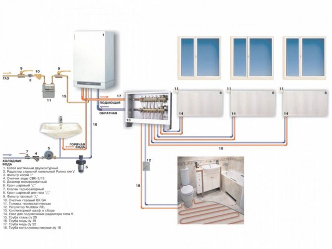 - Les circuits de tuyauterie muraux ou les murs d'eau chaude sont connectés à un système de chauffage hydraulique commun pour tout l'appartement ou la maison.