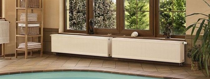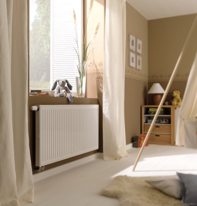 - Dimensions (modifier)... Les radiateurs en acier ne sont pas limités en taille, donc connaissant la puissance thermique minimale requise, vous pouvez choisir un appareil de chauffage de n'importe quelle taille. L'essentiel est que la longueur du radiateur soit d'au moins 50% de la largeur de l'ouverture de la fenêtre, de préférence sur toute la largeur de la fenêtre. Le long de l'axe vertical, la hauteur recommandée du radiateur au-dessus du sol est de 80 à 100 mm et la distance entre la batterie et le rebord de la fenêtre doit être d'au moins 100 mm. Lors du choix de la taille des appareils de chauffage, tenez compte des caractéristiques du futur emplacement.