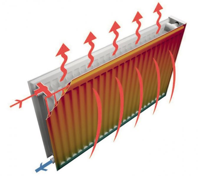 Le résultat est deux panneaux qui rayonnent de la chaleur, qui remplit le liquide de refroidissement à travers les buses, sur le côté intérieur de chacun il y a des nervures le long desquelles l'air circule: se réchauffant du rayonnement du radiateur, il monte, l'espace à l'intérieur se remplit d'air froid par le bas et ainsi de suite en cercle (effet de convection).