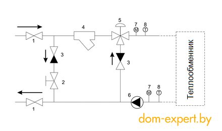 Le principe de fonctionnement peut être décrit en termes généraux. L'eau, c'est-à-dire un caloporteur à haute température, pénètre dans l'appareil de chauffage lui-même, passant d'abord par un carter filtrant, puis par une importante vanne à trois voies. Une petite pompe de circulation est utilisée pour faire couler l'eau à la bonne pression. L'eau, déjà refroidie, pénètre dans la tuyauterie, se dirige vers la chaudière, et une partie de son volume pénètre également dans la vanne.