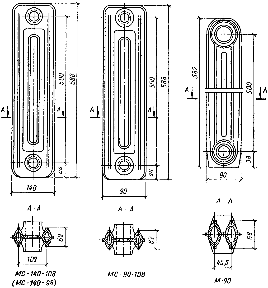 - Les radiateurs en fonte des marques de chauffage MS-140-180 et 98 ont des écarts entre les mamelons de 108 et 98 millimètres. Les appareils sont produits, comme le précédent, par la Russie et l'Ukraine.